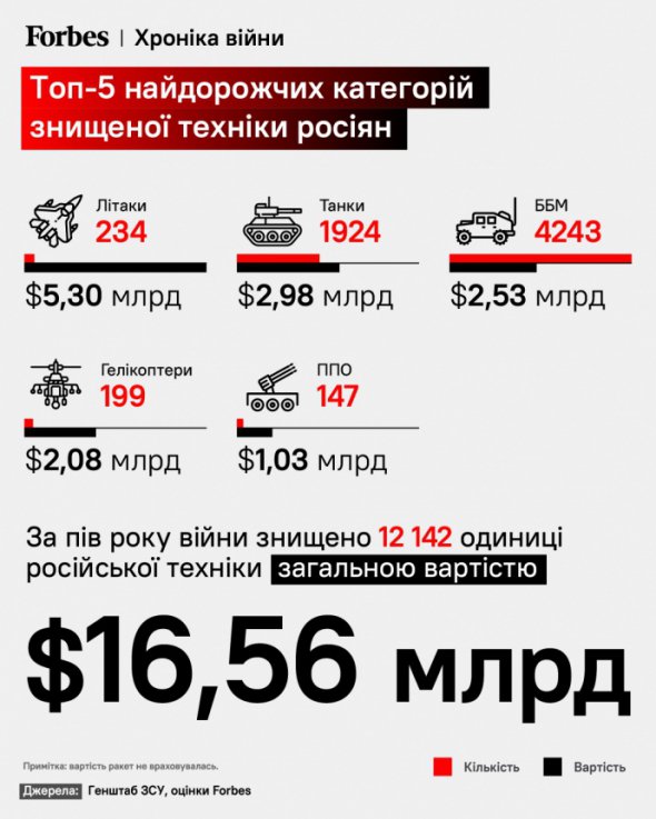 Россияне за шесть месяцев полномасштабной войны потеряли 12 142 единицы техники стоимостью $16,56 млрд без учета ракет.