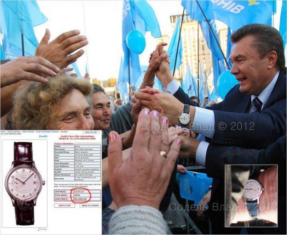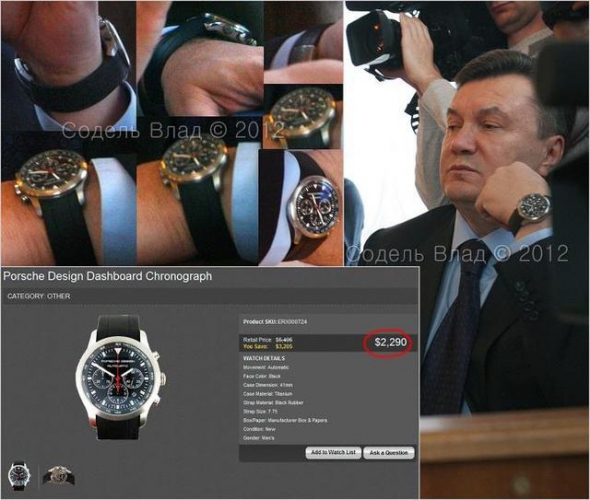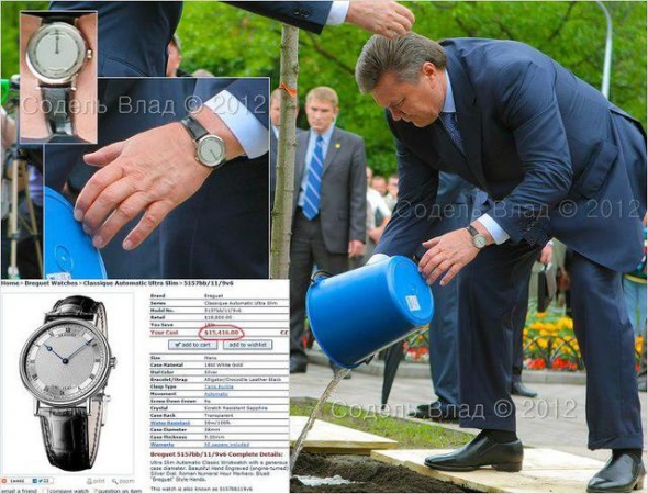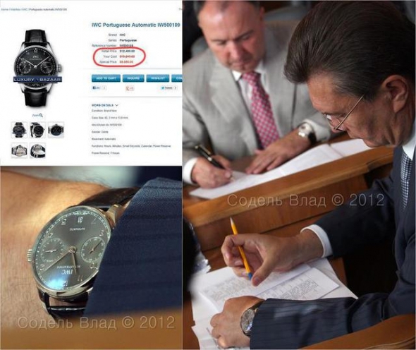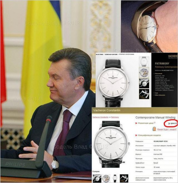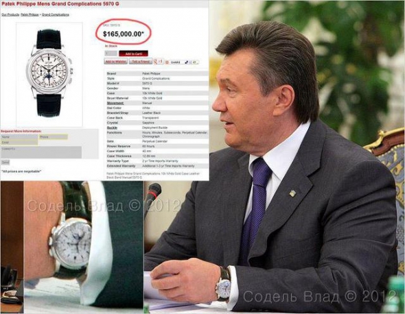 "Если не искать предварительных деклараций и считать, что Янукович за 2,5 года президентства уже получил 180 тыс. долларов, то в свою коллекцию часов он домазал еще 80 тыс., премьерской зарплаты, которые у него накопились в течение 3,5 лет - это вполне реально, учитывая что ЗП премьера тоже немаленькая. Но Янукович - человек, он должен что-то есть, ходить в одежде, ну и вообще, на содержание Межигорья нужны немалые средства... откуда они у него, спросите вы, когда он все потратил на часы? А все очень просто, ответит Янукович, - помните, я книжку в Австрии издал - 2 000 000 баксов гонорара, как с куста. Вот и вся история...", - цитирует Цензор.НЕТ запись фотографа Влада Соделя.