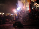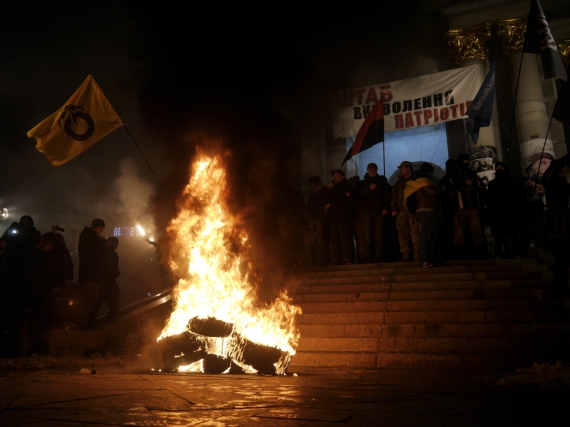 Сегодня во время проведения мероприятий, посвященных Дню достоинства и свободы Украины, произошли столкновения и толкотня между полицией и участниками. Во время вече на Майдане Независимости лидер ОУН Николай Коханивский и нардеп Игорь Луценко призвали участников вече принести и зажечь шины под стелой Независимости.