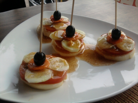 Сочетание огурца с медом придаст особый вкус многим закускам. По нашей просьбе Фернандо поделился еще одним рецептом летнего салата. Взял яблоко, очистил его, нарезал кружочками. Помазал сыром мацарелла. Нарезал кружочками свежие помидоры, огурцы. Положил на смазанное яблоко сначала помидор, затем три кольца огурцов. Полил все это медом с дробленым миндалем. Нанизал на высокую деревянную шпажку кружочек свежей моркови и маслину. Наколол его на яблоко с помидором и огурцами. Подал на стол.