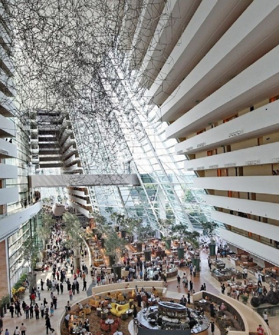 Кроме того, здесь имеется заполненный водой канал, наподобие венецианского, по которому плавают гондолы, а над ним переброшены пешеходные мостики, сообщает relaxic.net. Около отеля построены офисные и торговые помещения под волнистыми крышами.