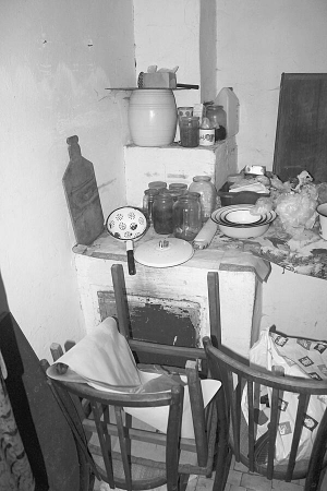 В коридоре отодвигает тяжелые двери кладовой. За ними сложены кресла, много банок и кастрюль.