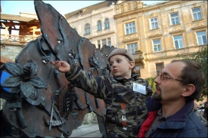 — Металлические пластины по форме областей выковали предварительно. Над ними работали десять человек. Сейчас изготовляем украшения для карты, — объясняет организатор фестиваля Иван Борисяк, 27 лет. — Кто имеет желание, кует символ своего региона. Кузнецы собрались из всей Украины.