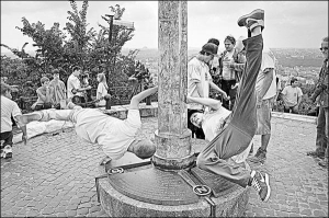 18-летний Юрий Корнелюк привязывает к ноге флаг с эмблемой города — пятью разноцветными башнями. Взбирается на флагшток, позируя перед фотокамерами.