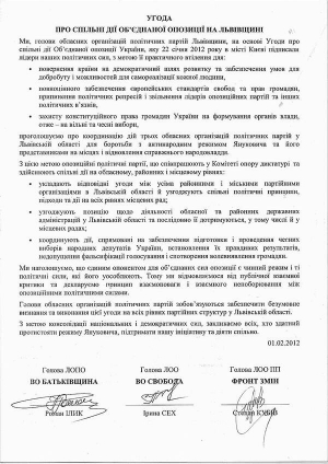 Документ заключен на основе Соглашения о совместных действиях объединенной оппозиции Украины, которое 22 января 2012 года в Киеве подписали лидеры политических сил.