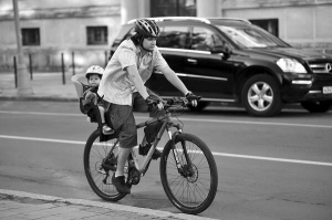 — Чтобы не трясти ребенка, приходится слезать с велосипеда на каждом бордюре, — продолжает. — Также нет велопарковок. Привязываю велосипед к водосточным трубам. Мешает и плохое качество автодорог. По правилам, должен ехать в метре от края дороги. А там всегда лужи.