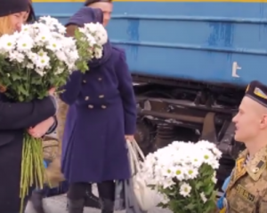 Девушка встречала любимого, который вернулся с АТО. Но сначала из вагона выходили товарищи парня по службе, которые вручали девушке цветы. После этого появился сам виновник торжества и сделает любимой предложение стать его женой.
