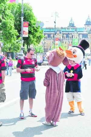 - Нет, мало, - говорит ее товарищ в костюме утки Скруджа МакДака. Иностранец дает 50 грн.