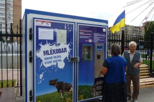 "Молокомат", автоматическое устройство по продаже свежего молока установили возле столичного метро Печерская. Работает круглые сутки. Литр стоит семь гривен, приблизительно как и в супермаркетах. Можно купить от одного до пяти литров. Купюры надо вводить в приемник без сдачи. Каждых три дня к автомату подвозят две герметичные цистерны по 200 литров. Каждая оборудована насосом и мешалкой. Непастеризованное цельное молоко доставляют с ферм Киевщины. В устройстве оно охлаждается до плюс 4 градусов. После каждой выдачи трубка подачи и ниша для посуды промывается водой. Ее заливают в отдельную цистерну. Прибор имеет систему слежения за работой. В случае поломки отправляет тревожное СМС-сообщение на пульт охраны. Областная власть обещает до конца года установить в Киеве 30 "молокоматов". В Чехии их закупают по 15 тысяч евро.