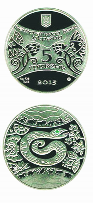 Монету "Год Змеи" вычеканили из 15,5 грамма серебра. На аверсе изобразили герб Украины, на реверсе — змею. Вокруг нее фигурки — символы восточного календаря. Глаз змеи — кристаллик циркония диаметром 1,25 мм. Всего вычеканили 25 тыс. штук. Номинал монеты — 5 грн. Банки продают по 390 грн.