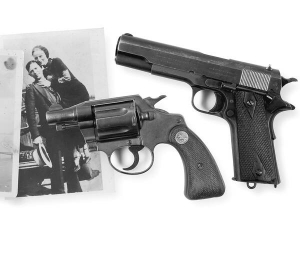 Два пистолета "кольт", принадлежавшие грабителям Бонни Паркеру и Клайду Барроу, продали из аукциона за $264 тыс. и $240 тыс. Пара промышляла в американских штатах Техас и Луизиана. С 1928 по 1934 год ограбили три десятки магазинов и банков, убили 13 человек. Погибли в 1934-м. Бонни и Клайд стали популярными персонажами американского кино. После их убийства оружие подарили офицеру, участвовавшему в полицейской засаде. Его потомки выставили пистолеты на аукцион.