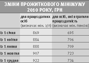 27 квітня Верховна Рада затвердила Держбюджет на 2010 рік. Він передбачає встановлення прожиткового мінімуму для різних категорій населення. За ними вираховують мінімальні зарплати, пенсійні виплати та соціальну допомогу.