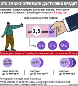 Можно будет получить заем до 1,5 млн грн на пять лет. Под 5% годовых будут давать кредиты бизнесу, который предусматривает выручку до 25 млн грн. И предприниматель создает как минимум два рабочих места. Если новых рабочих мест не будет — будет иметь кредит под 7%. Бизнес с выручкой до 50 млн грн может получить заем под 9% годовых.