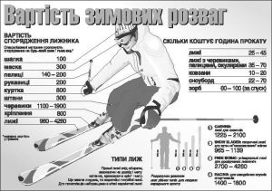 Подъем на бугеле стоит от 2,50 до 5 грн. Лыжи напрокат — 25–45 грн/год. Можно брать еще и ботинки, маску. Второй час обойдется наполовину дешевле. На выходных прокат дороже.