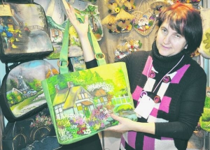 Шьет и расписывает красками сумки 48-летняя Надежда Михайлова из Кременчуга Полтавской области. Продает их в столичные магазины. Портниха привезла свои сумки в Международный выставочный центр, возле метро Левобережная в Киеве. Там действовала выставка "Хенд мейд".