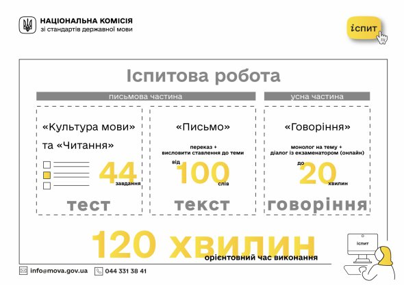 Имеет четыре испытательные модули за которые максимально можно получить 158 баллов. За культуру языка - 42, чтение - 20, письмо - 37 и говорение - 59 (29 - за диалог и 30 - за монолог). Уровень культуры речи и чтения проверяются тестовыми заданиями. Письмо - созданием текста до 100 слов. Говорение 20-минутным рассказом на заданную тему. Результат за каждую часть составит 25% от общей оценки.