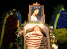 В 11:00 к театру подъехал черный катафалк. Четверо мужчин в серых камзолах с логотипом похоронного бюро "Анубис" занесли гроб на 2-й этаж театра в так называемый зеркальный зал. Поставили его на возвышение, застеленное черным бархатом. Перед ним положили 3 буханки хлеба с зажженными восковыми свечами.