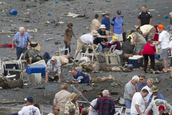 Как сообщил на пресс-конференции организатор шоу Хаутон, управлявший истребителем времен Второй мировой войны P-51 Mustang пилот Джимми Лиуард, предположительно, не справился с управлением, и самолет обрушился на людей, наблюдавших за шоу.