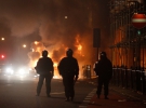 В ходе протестов были подожжены несколько полицейских автомобилей и автобусов, магазины, автоцентры.