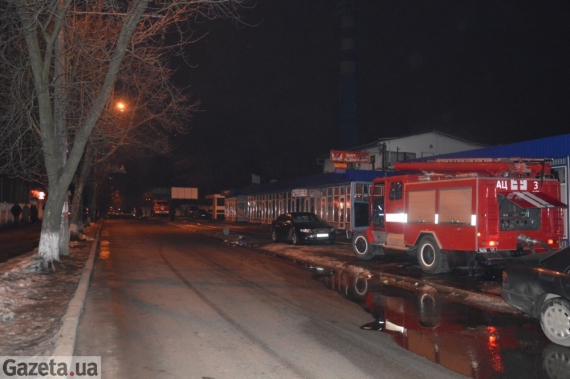 Три пожарных автомобиля сразу прибыли на место и приступили к тушению. Из-за плотной застройки рынка спасатели были вынуждены тянуть шланги к месту пожара через всю территорию. Густой дым с искрами валил к небу, а зарево было видно за несколько метров.