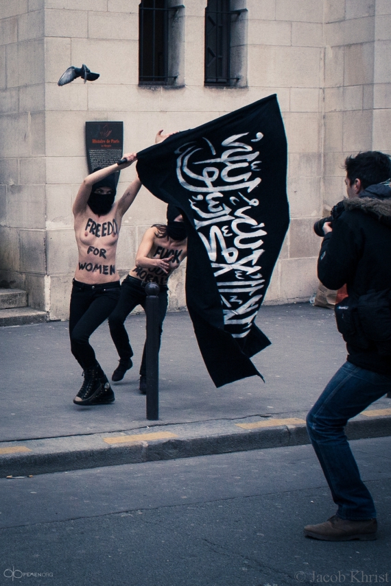 Тунисская активистка "FEMEN" Мериам сожгла флаг салафитов у главной мечети в Париже, как символ борьбы женщин с диким религиозным экстремизмом.