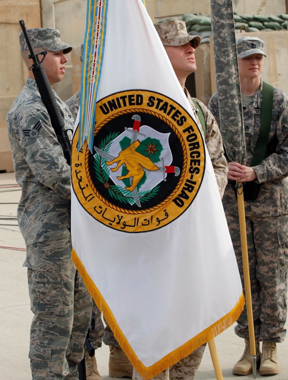 Торжественная церемония, в ходе которой на военной базе под Багдадом был спущен американский флаг, проходила в присутствии высокопоставленных чинов Пентагона, в том числе министра обороны США Леона Панетты.