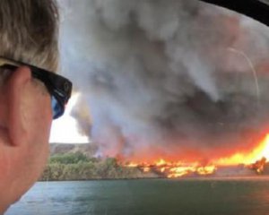 Огонь от лесных пожаров перекинулся на траву возле реки. Затем сильные порывы ветра образовали воронку, как при торнадо. Крис Мэки снял происходящее на камеру из своего автомобиля и выложил видеозапись в YouTube.