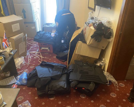 Дома у мужчины нашли более 120 бронежилетов и касок, более 500 индивидуальных перевязочных пакетов и аптечек.
