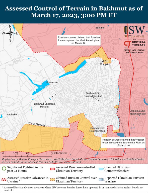 Видеозаписи с геолокацией, опубликованные 17 марта, показывают, что российские войска добились незначительных успехов в северной части Бахмута. Госпогранслужба Украины сообщила, что ВСУ вступили в бой с боевиками "Вагнера" в промзоне в Бахмуте.