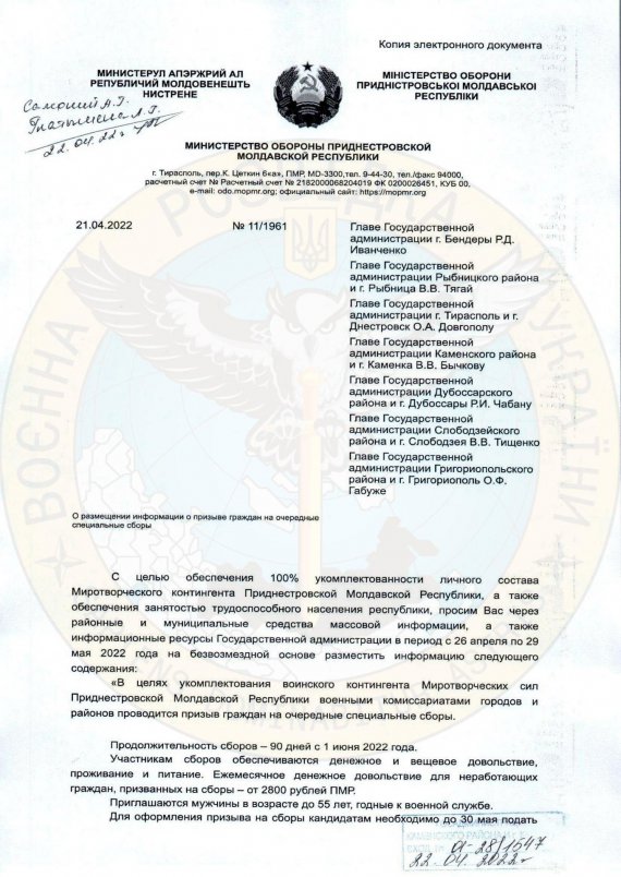 "Несмотря на формальную добровольность участия в сборах, есть информация, что призыв будет носить принудительный характер. Примечательно, что письмо датировано 21 апреля. То есть до начала последних российских провокаций на территории ПМР. Это напоминает события в так называемых ЛДНР", - пишут в разведке.