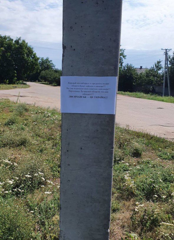 "Лисичанск тоже партизанит. "Добрые люди" расклеили во временно оккупированном Лисичанске листовки с "приветами" оккупантам и коллаборантам" – рассказал Гайдай.
