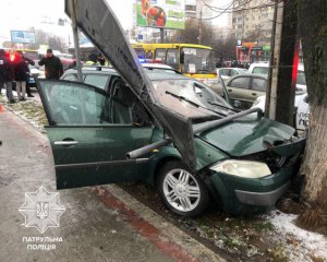 Убегая от экипажа патрульных, водитель Renault Megane промчался на красный свет и въехал в людей. После этого влетел в дерево и дорожный знак на перекрестке с ул. Черновила.