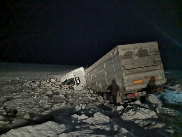 Водитель крупногабаритной фуры не справился с управлением, в результате чего грузовик пробил ограждение дороги и, проломив лёд, заехал в воду.