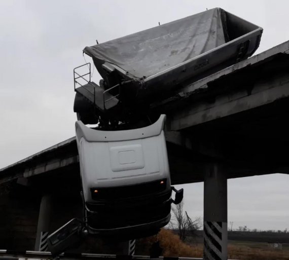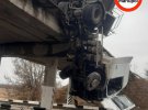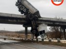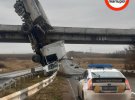 В Донецкой области на трассе Мариуполь-Волноваха фура задела на дороге отбойник и повисла на мосту.