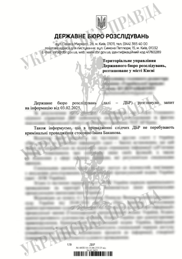 "В производстве следователей ГБР не находятся уголовные производства в отношении Ивана Баканова", - говорится в ответе бюро.