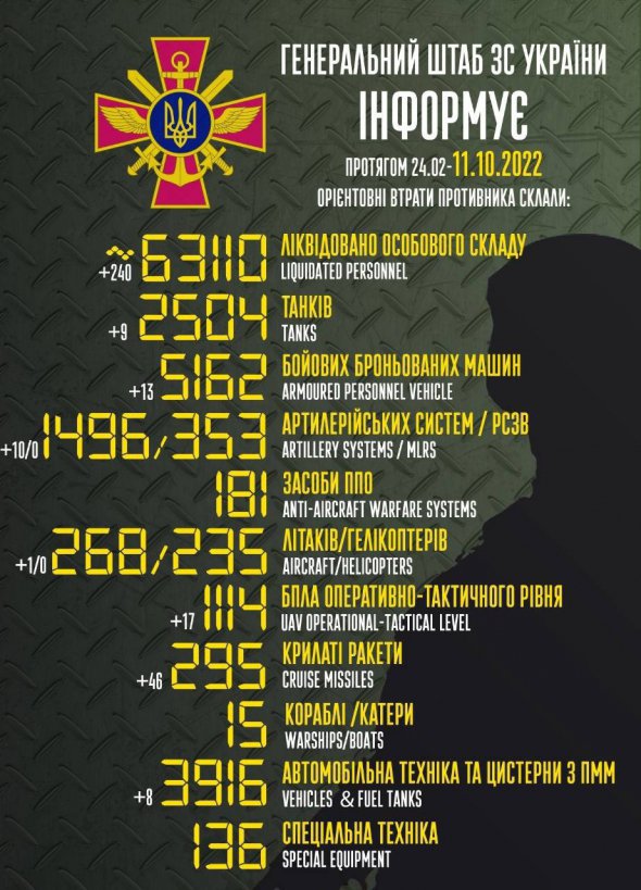 Общие боевые потери России на утро 19 октября составляют более 66 280 человек.