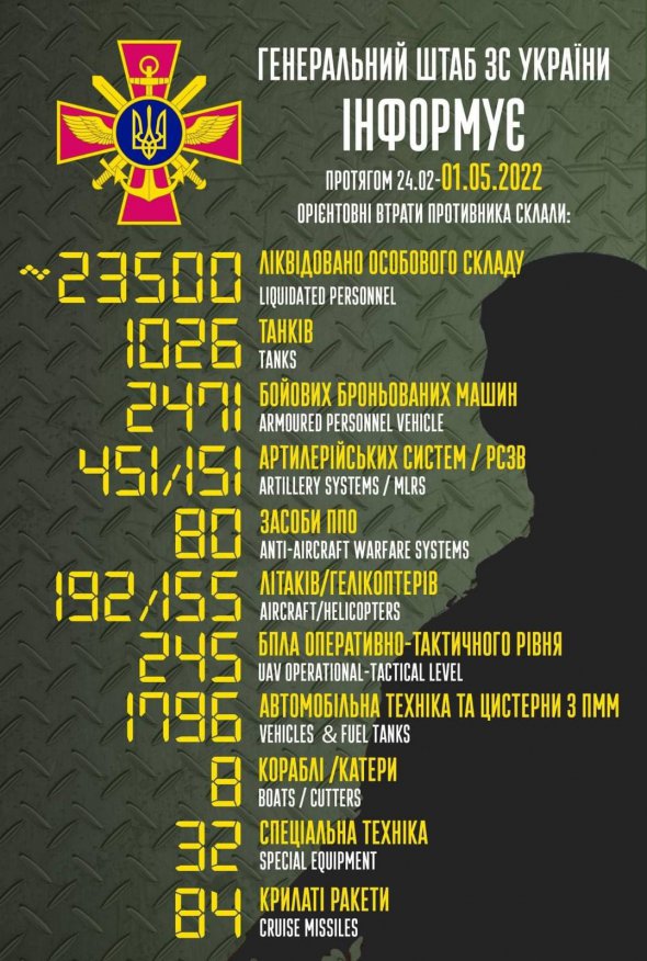 Потери российских оккупантов в Украине на 1 мая составляют примерно 23,5 тыс. человек.