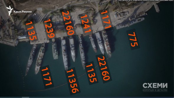 В частности, на спутниковых снимках Planet Labs за 9 ноября, имеющихся в распоряжении журналистов "Схем" и "Крым.Реалии", были идентифицированы крупные десантные корабли (проектов 1135, 1171, 775), патрульные корабли (22160), ракетные катера (проектов 1239, 1241) и крейсер (проекта 11356) – это либо флагман Черноморского флота РФ "Адмирал Макаров", либо его аналог "Адмирал Эссен".