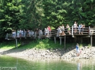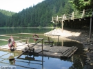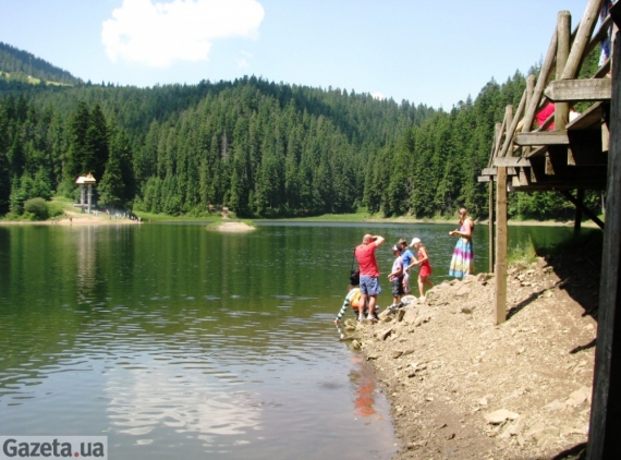 "Синевирское озеро называют еще Морским глазом. Оно образовалось в результате перекрытия речной долины сдвигами в послеледниковый период. Вода в нем прозрачная и холодная. Даже в эти жаркие дни она не прогревается глубже 1 метра. Купаться и рыбачить здесь не разрешают. Ранее запрещали костер разжигать и палатки напялить. А теперь за разрешение берут по 15 грн, а за 20 грн можно пользоваться беседки", - рассказывает друзьям-туристам Андрей Омельчук из Львова. Компания собирается заночевать у озера.