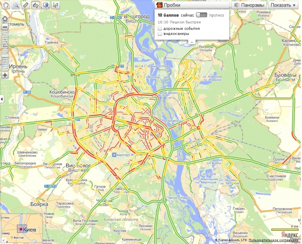 По состоянию на 18.00 12 декабря в столице наблюдаются заторы в 10 баллов (из 10 возможных). Об этом сообщает "Украинская правда" со ссылкой на сервис "Яндекс. Пробки".