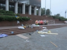 Несколько неизвестных в одежде работников коммунальных служб устроили погромы в лагере защитников украинского языка возле Украинского дома в Киеве. Об этом сообщил координатор акции протеста Виктор Горбач.