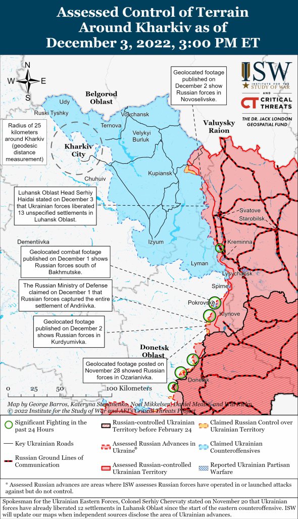 "На видео с геолокацией, опубликованном 3 декабря, видно, как российские силы действуют ближе к Георгиевке (в пределах 30 км к юго-западу от Авдеевки). В минобороны России утверждают, что украинские войска безуспешно пытались восстановить утраченные позиции вблизи Авдеевки и Марьинки. 3 декабря российские войска продолжали вести оборонные действия на западе Донецкой и востоке Запорожской областей", – говорится в сообщении.