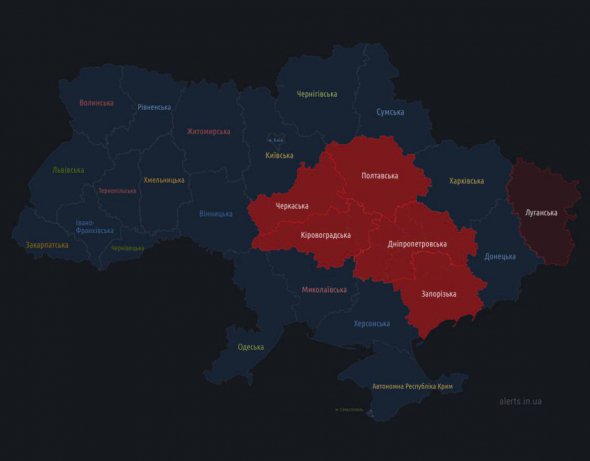 На 8:20 воздушная тревога объявлена в Днепропетровской, Черкасской, Полтавской, Кировоградской и Запорожской областях.