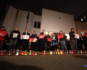 Перед зданием установили свечи и лампадки, около десяти человек держат красные плакаты с надписями "Кто заказал убийство Кати Гандзюк?", "Кто убийцы Кати Гандзюк?" и портретам Екатерины, об этом сообщает Укринформ.