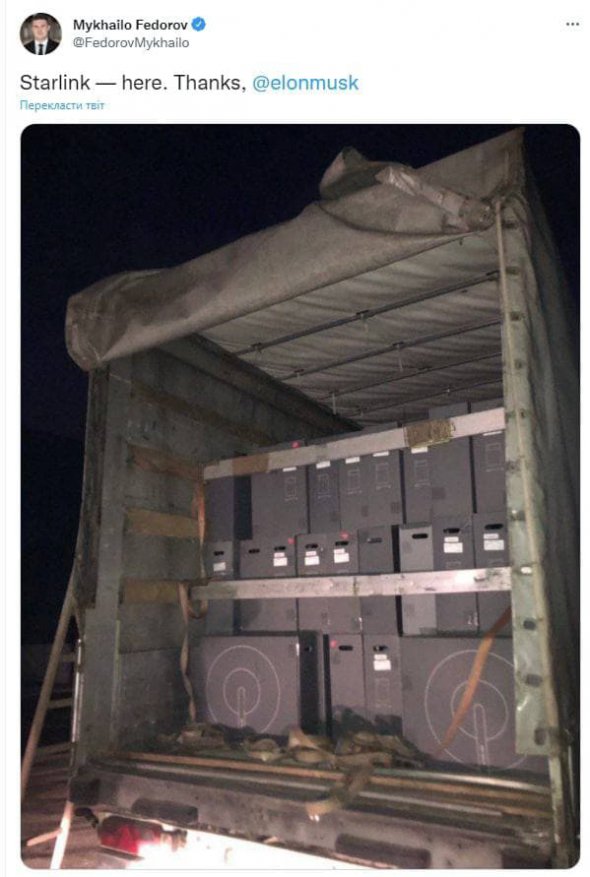 "Первая партия станций спутникового Интернета StarLink прибыла в Украину! Спасибо Илону Маску и всем партнерам свободной Украины!