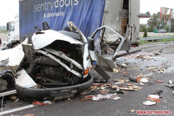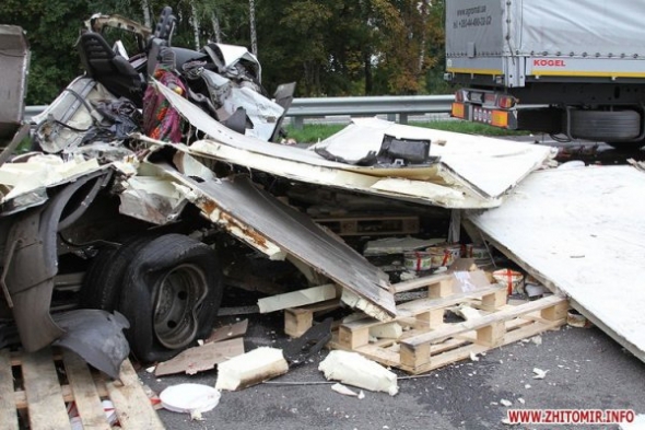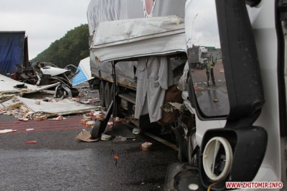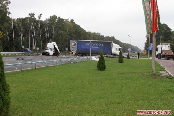 Утром 18 сентября в Житомирской области на 80 км трассы Киев-Чоп столкнулись четыре фуры. Двух водителей доставили в больницу.