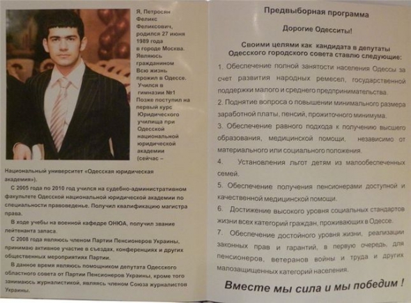 Тем временем, сам Феликс Петросян-младший с момента аварии успел закончить Юракадемию и начать активную коммерческую и политическую деятельность. На выборах 2010 года в почтовых ящиках одесситов появилась брошюра кандидата в депутаты горсовета Феликса Петросяна. Он, согласно листовке, обещал "осчастливить" всех горожан "трудоустройством на основе развития ремесел", а также "обеспечением законных прав и гарантий для пенсионеров и других малозащищенных слоев населения". Петросян-младший шел под шестым номером в списке Партии пенсионеров Украины (ранее его отец возглавлял эту политсилу). О себе в агитке Феликс сообщил: помощник депутата облсовета и член Союза журналистов Украины. К слову, ни один кандидат от ППУ в одесскую думу так и не прошел. А глава одесской облорганизации Союза журналистов Юрий Работин в 2011 году подтвердил, что Петросян-младший — член его профсоюза.