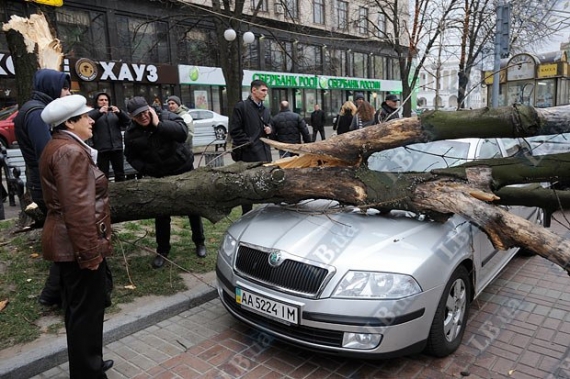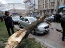 В Киеве по улице Крещатик, 7/11 ураганный ветер повалил дерево на три автомобиля.