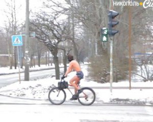 В Никополе Днепропетровской области мужчина только в трусах и с шарфом на шее катался на велосипеде.