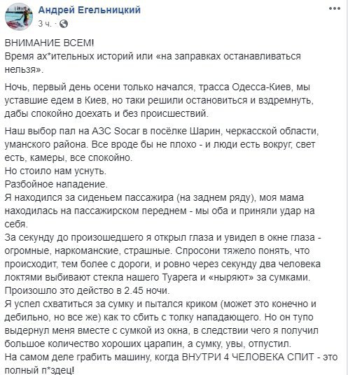 Об этом событии сообщил пострадавший Андрей Егельницкий в Fасеbook, передают Факты.